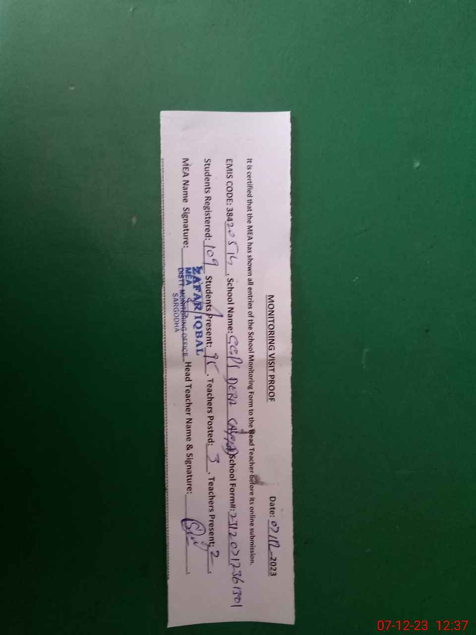 | Attendance Register | Head Teacher | MEA with School | Visit Proof |