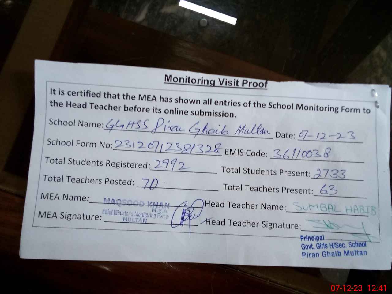 | Monitoring Date: 07-12-2023 | Start Time: 07-12-2023 12:03 PM | End Time: 07-12-2023 12:42 PM | Name of MEA: MA**** ULHA**** KH**** | |