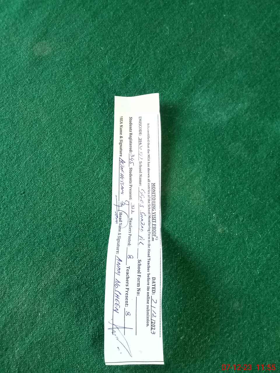 | Monitoring Date: 07-12-2023 | Start Time: 07-12-2023 11:36 AM | End Time: 07-12-2023 11:58 AM | Name of MEA: AL**** HU**** | |