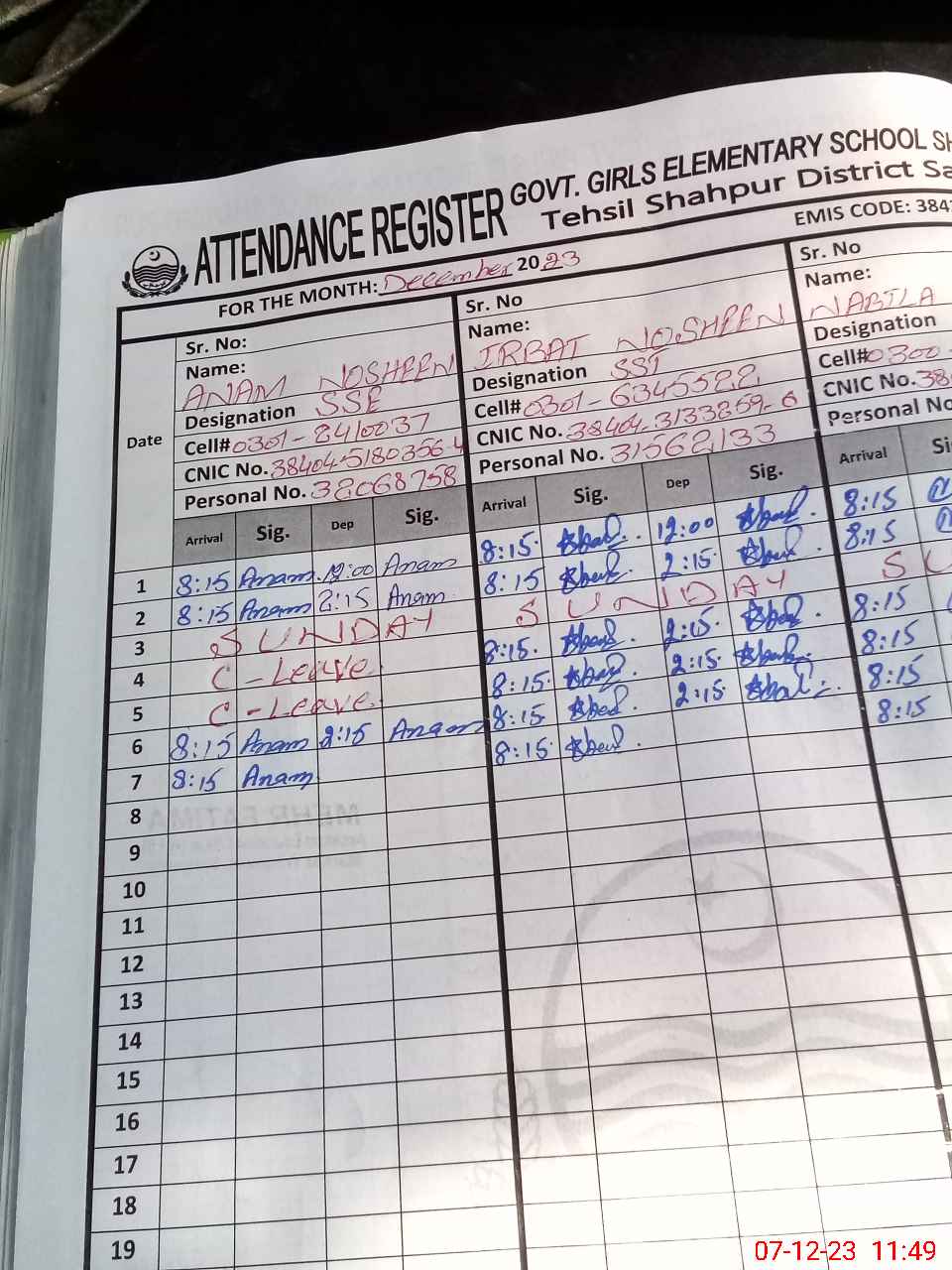 | CNIC | Full Name | Designation | R/C | Absence During Last Calender Month |