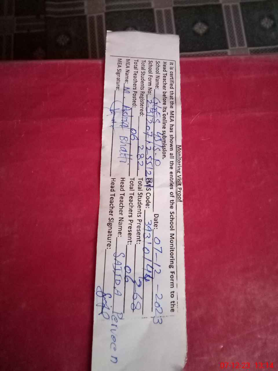| Attendance Register | Head Teacher | MEA with School | Visit Proof |