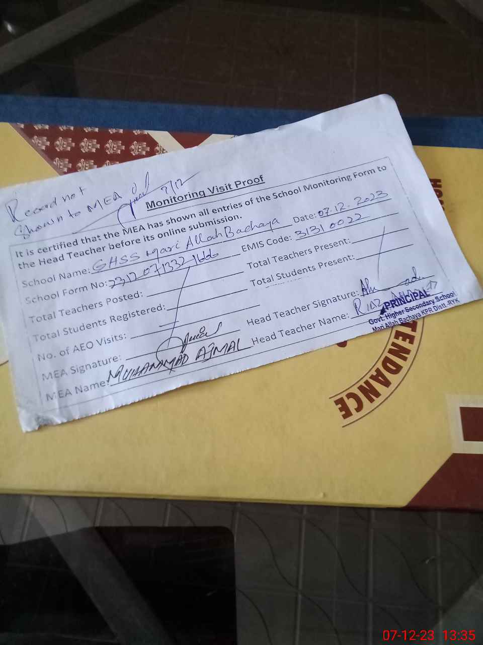 | Attendance Register | Head Teacher | MEA with School | Visit Proof |