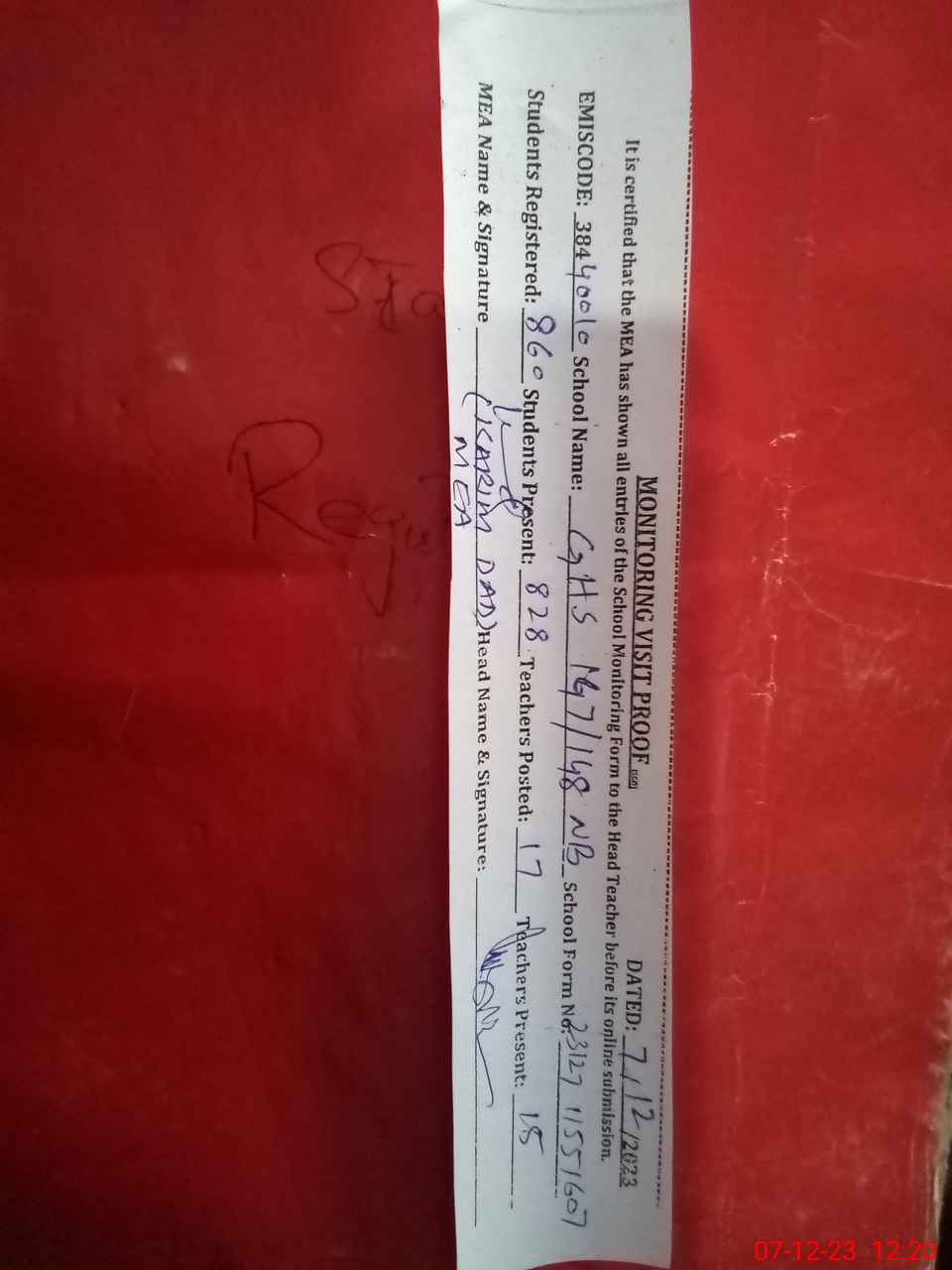 | Certified that this School was Inspected by the Undersigned MEA/DMO Today and the Information Stated Above is as Per Record. | |||||