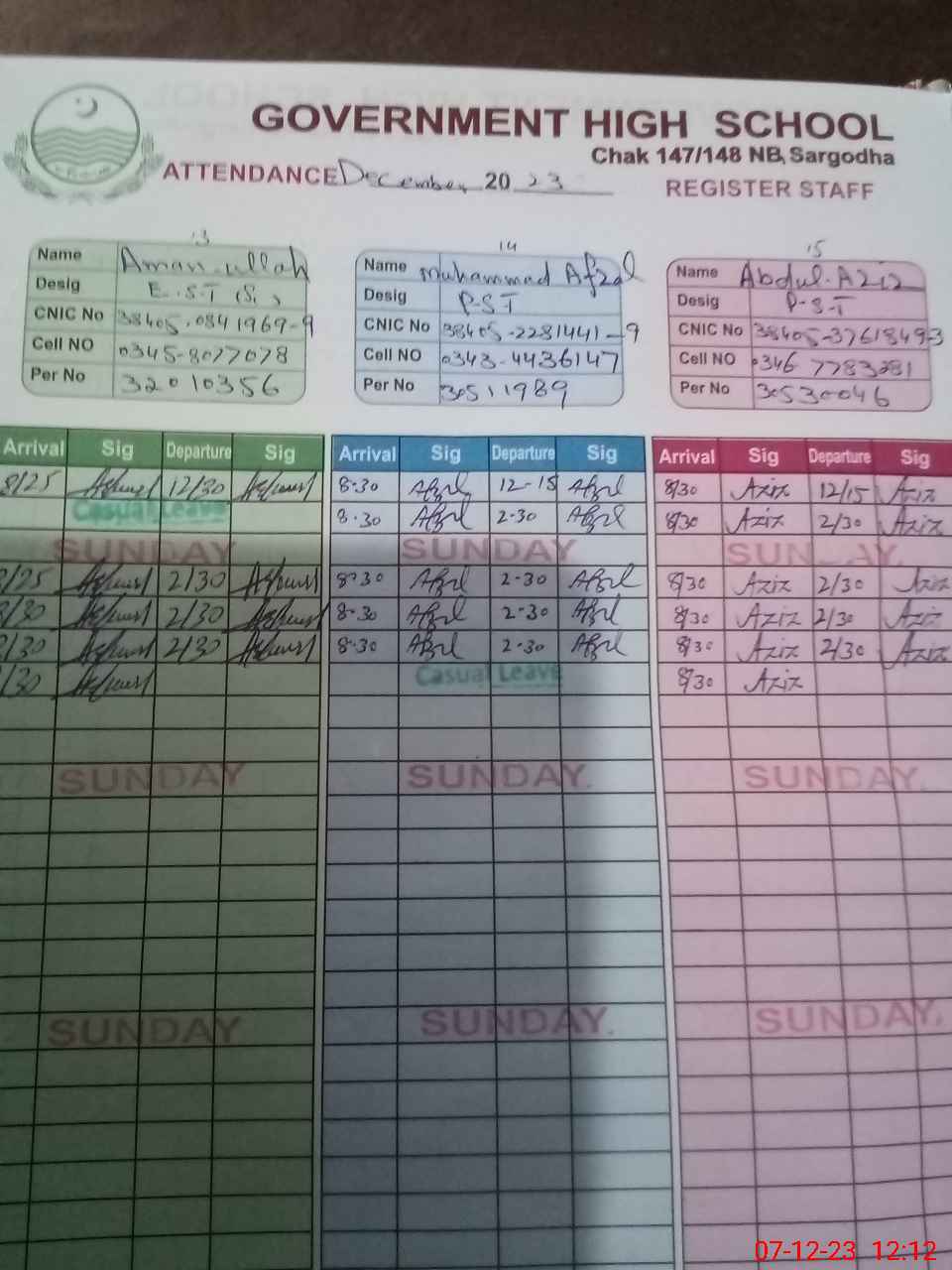 | CNIC | Full Name | Designation | R/C | Absence During Last Calender Month |