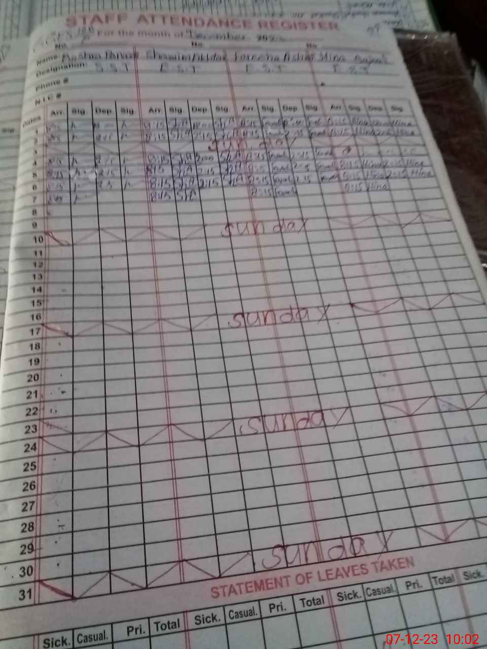 | CNIC | Full Name | Designation | R/C | Absence During Last Calender Month |