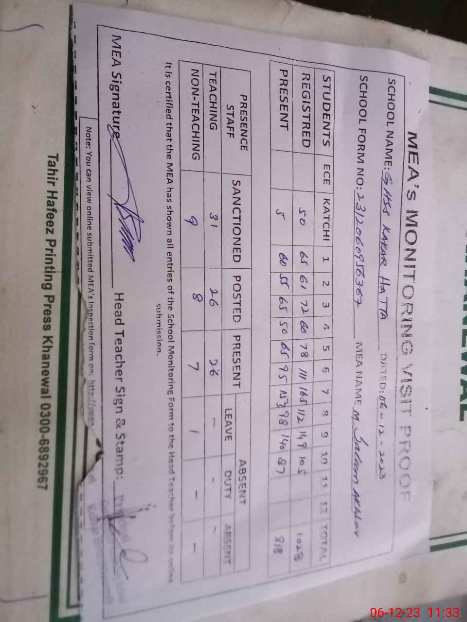 | EMIS Code: 36410026 | Name of School: GHSS KUKKAR HATTA, NAWAN SHEHR | |||
