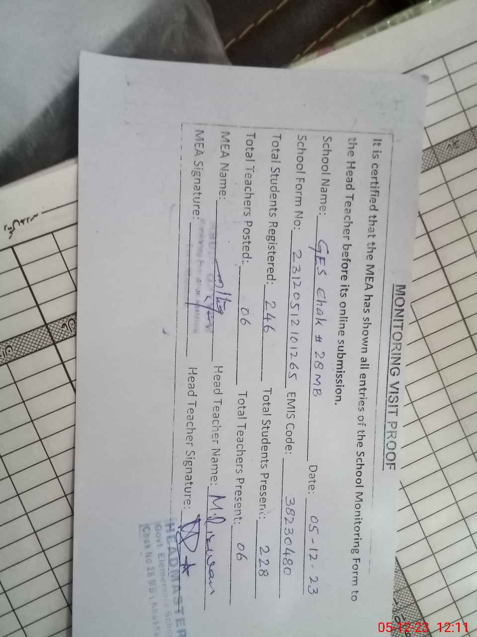 | Attendance Register | Head Teacher | MEA with School | Visit Proof |