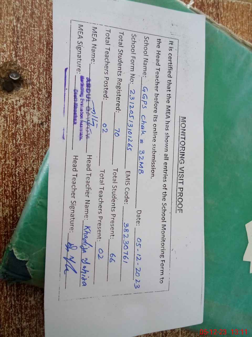 | Attendance Register | Head Teacher | MEA with School | Visit Proof |