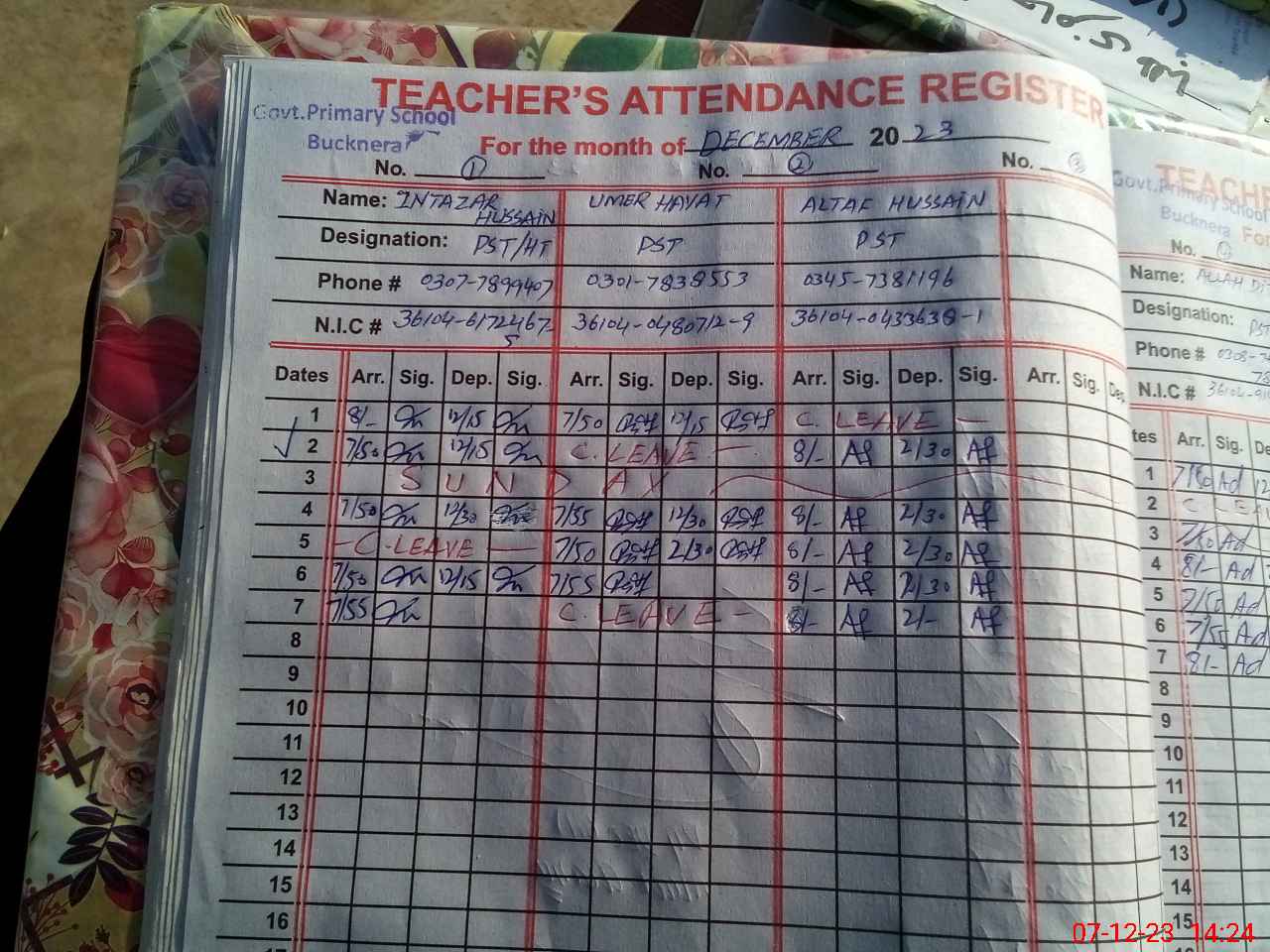| CNIC | Full Name | Designation | R/C | Absence during last cal. month |