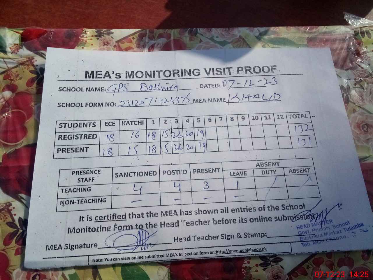 | Attendance Register | Head Teacher | MEA with School | Visit Proof |