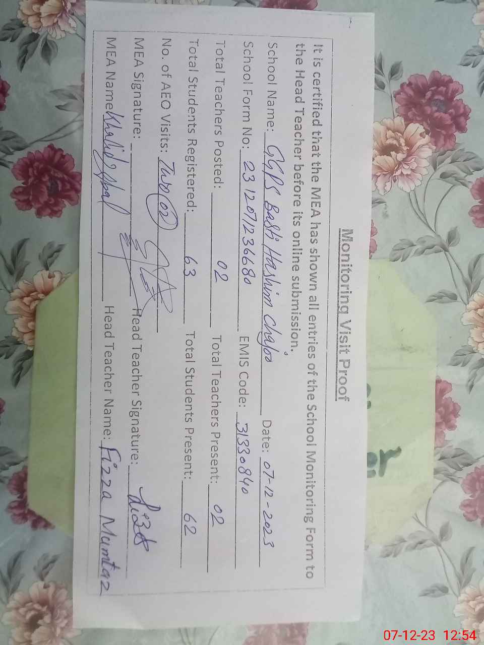 | Attendance Register | Head Teacher | MEA with School | Visit Proof |