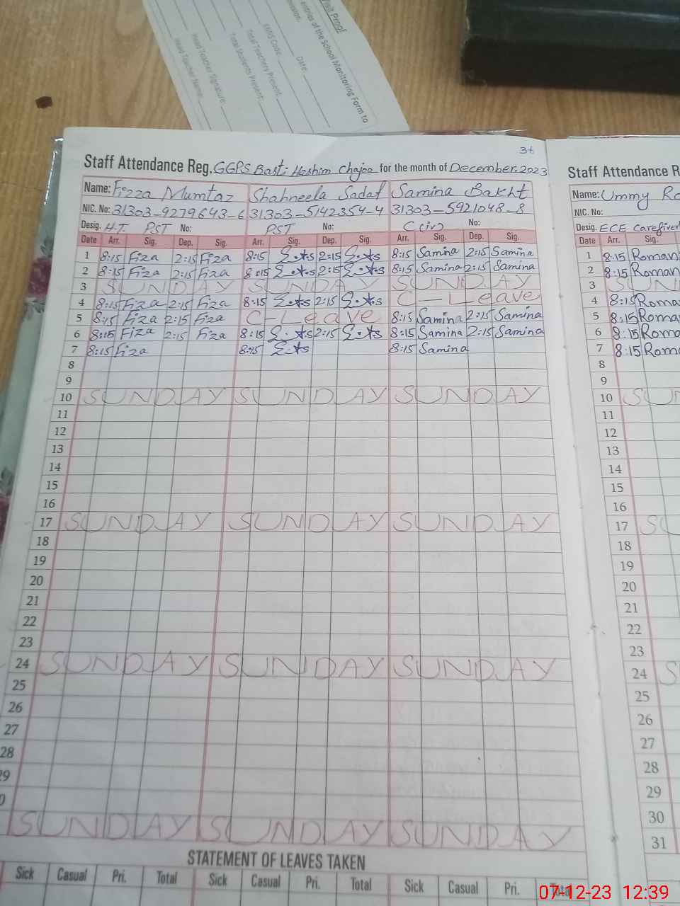 | CNIC | Full Name | Designation | R/C | Absence During Last Calender Month |