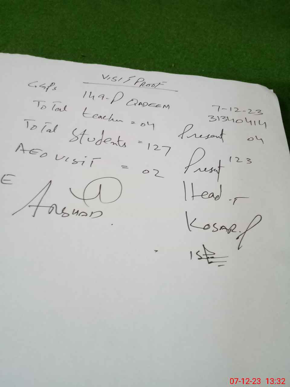 | Attendance Register | Head Teacher | MEA with School | Visit Proof |