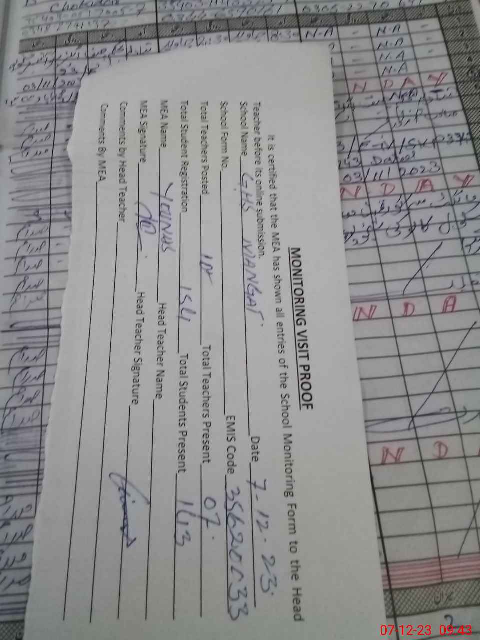 | Attendance Register | Head Teacher | MEA with School | Visit Proof |