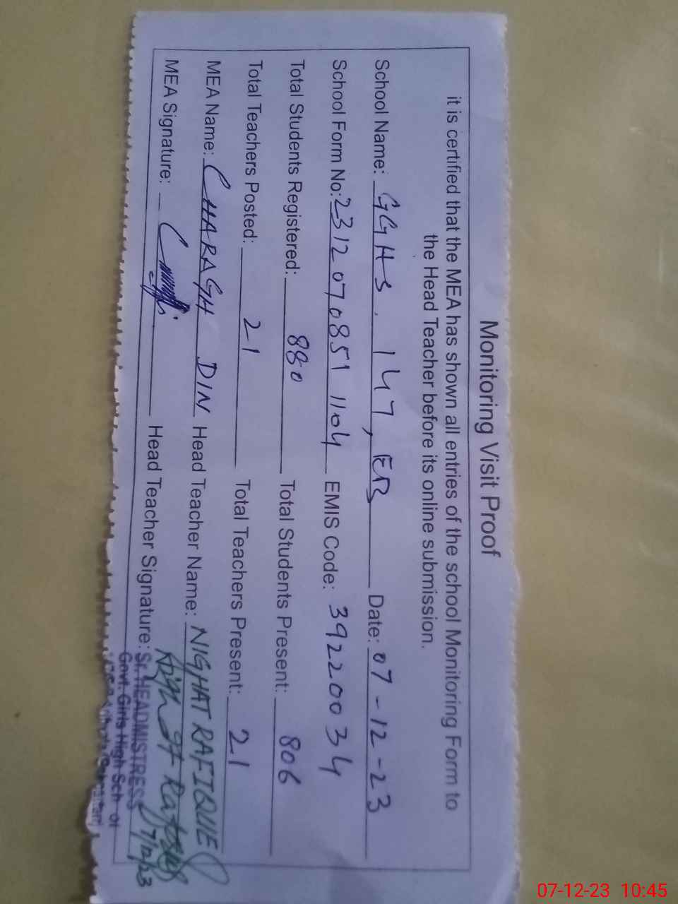 | Attendance Register | Head Teacher | MEA with School | Visit Proof |