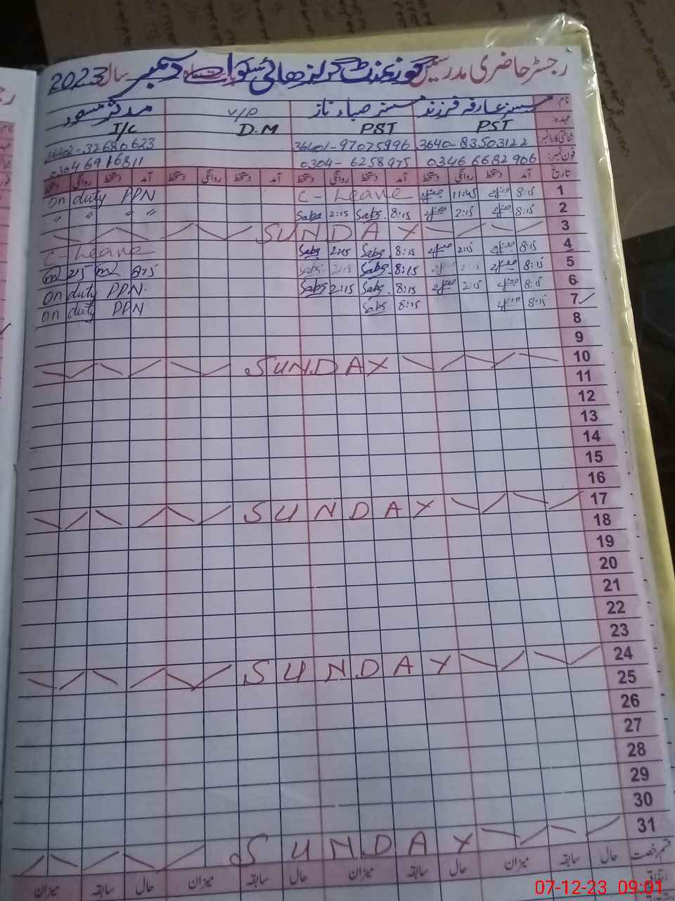 | CNIC | Full Name | Designation | R/C | Absence During Last Calender Month |
