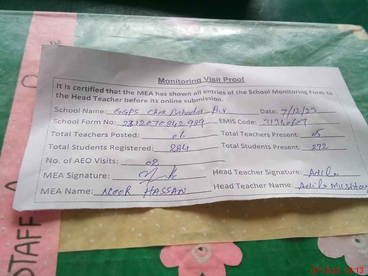 | Attendance Register | Head Teacher | MEA with School | Visit Proof |