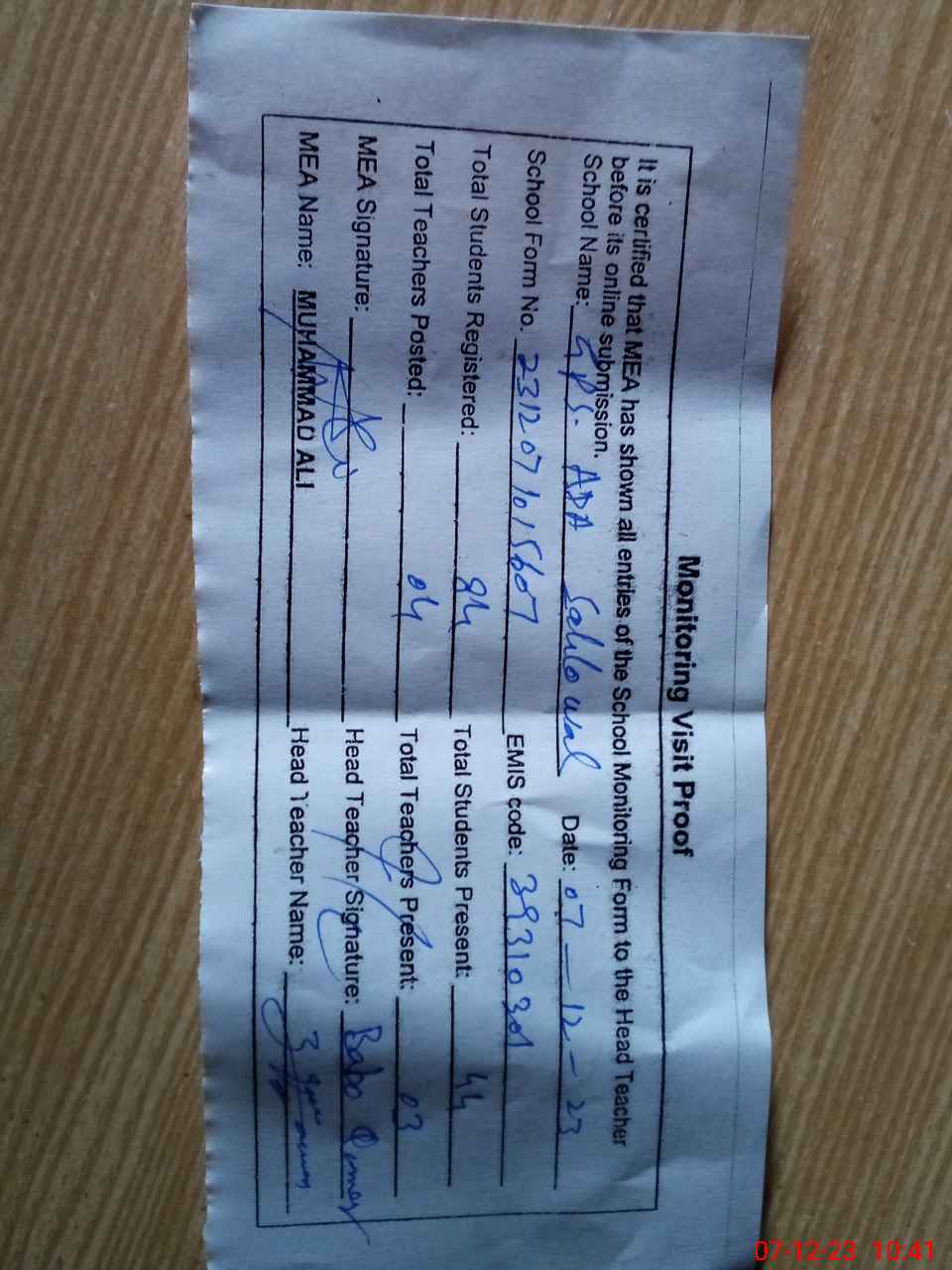 | Attendance Register | Head Teacher | MEA with School | Visit Proof |