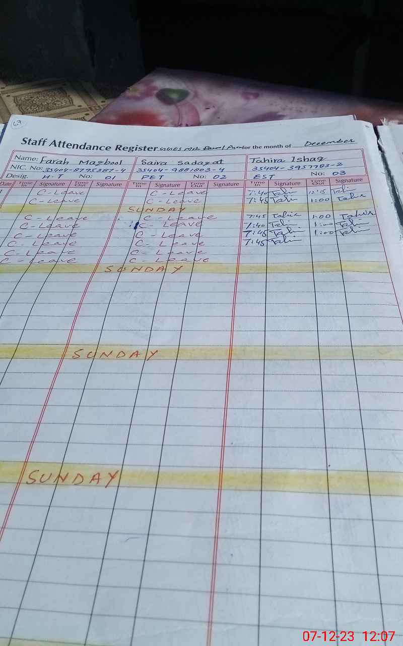 | CNIC | Full Name | Designation | R/C | Absence During Last Calender Month |