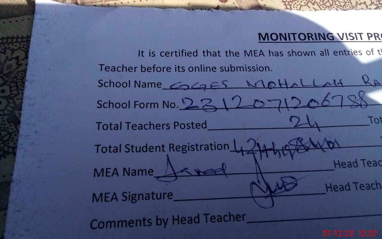 | Attendance Register | Head Teacher | MEA with School | Visit Proof |