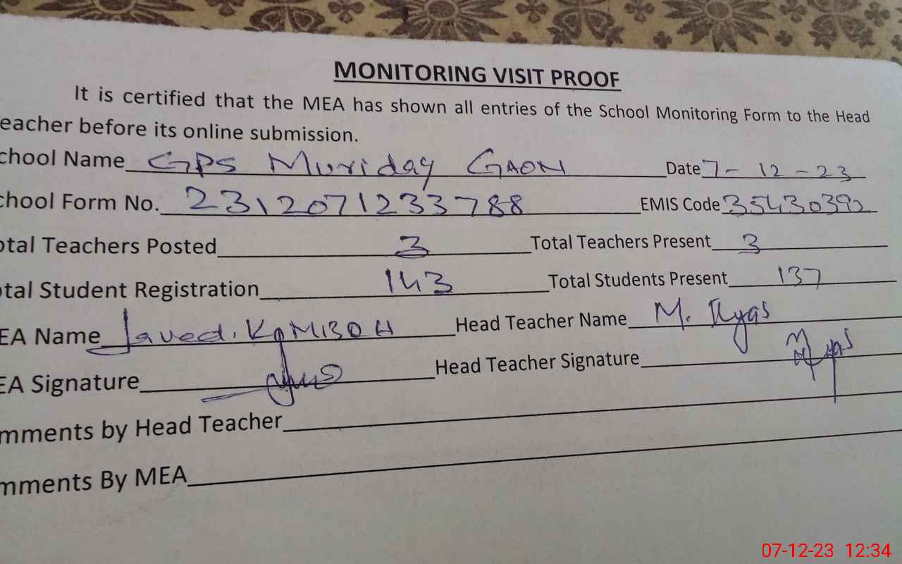 | EMIS Code: 35430392 | Name of School: GPS MURIDKEY GAON | |||
