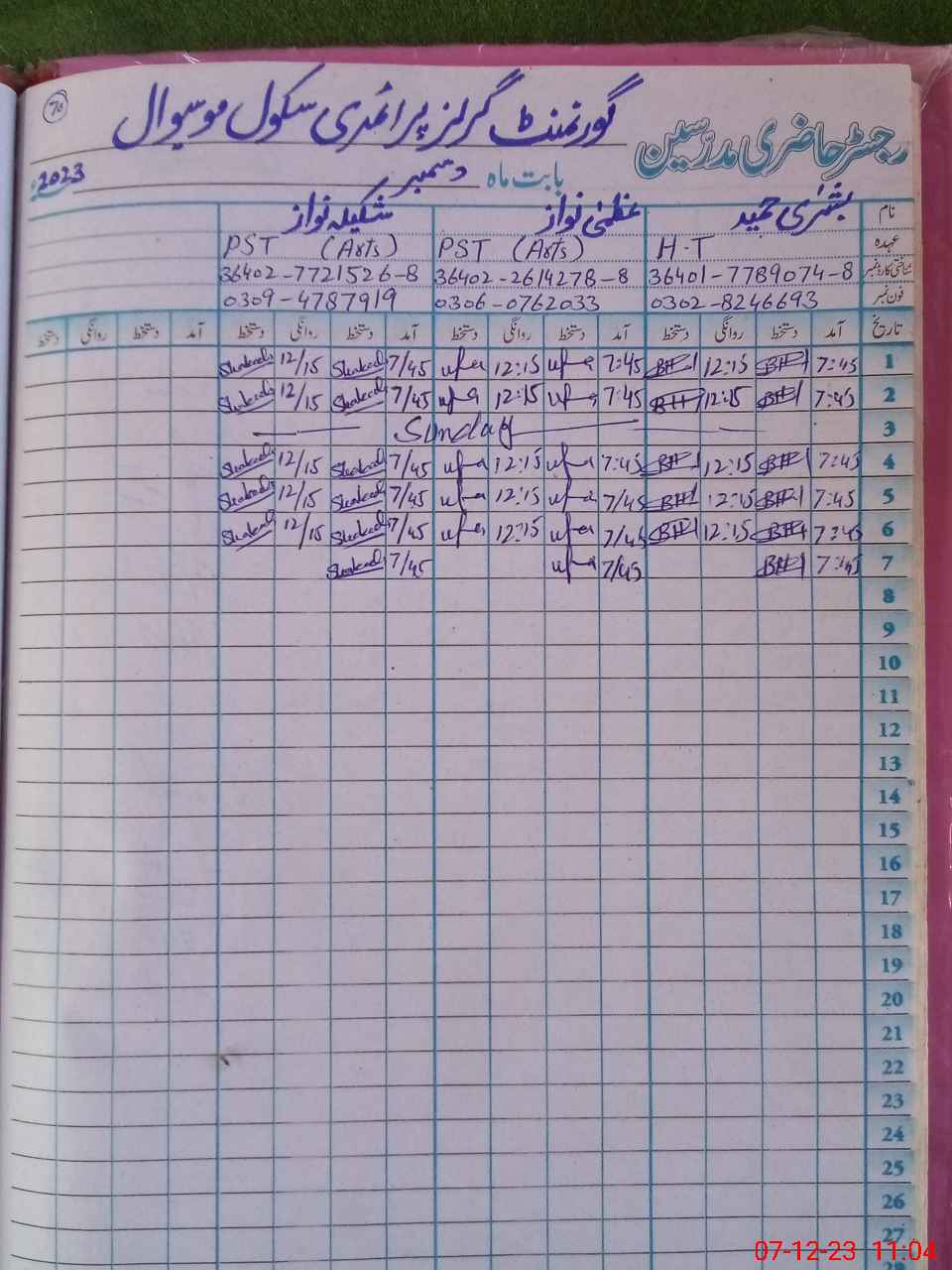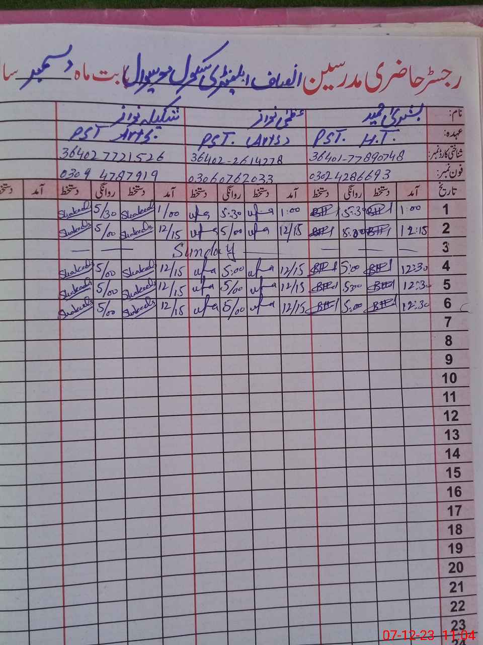 | Name: Uz**** Na**** Designation: (School Headmaster's/Headmistress's) PST Phone/Cell Number: 03**** |