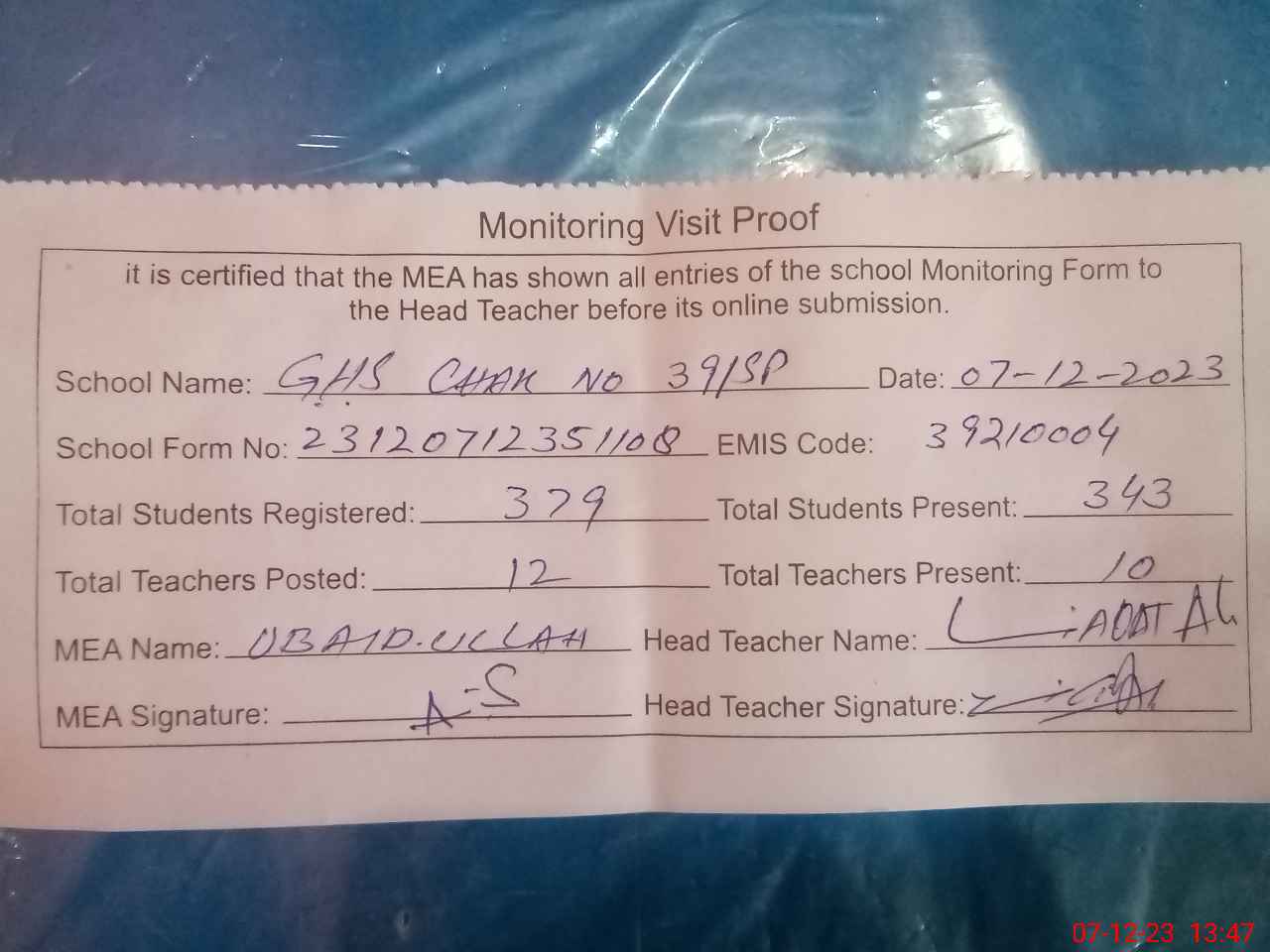 | EMIS Code: 39210004 | Name of School: GHS 39/S.P | |||