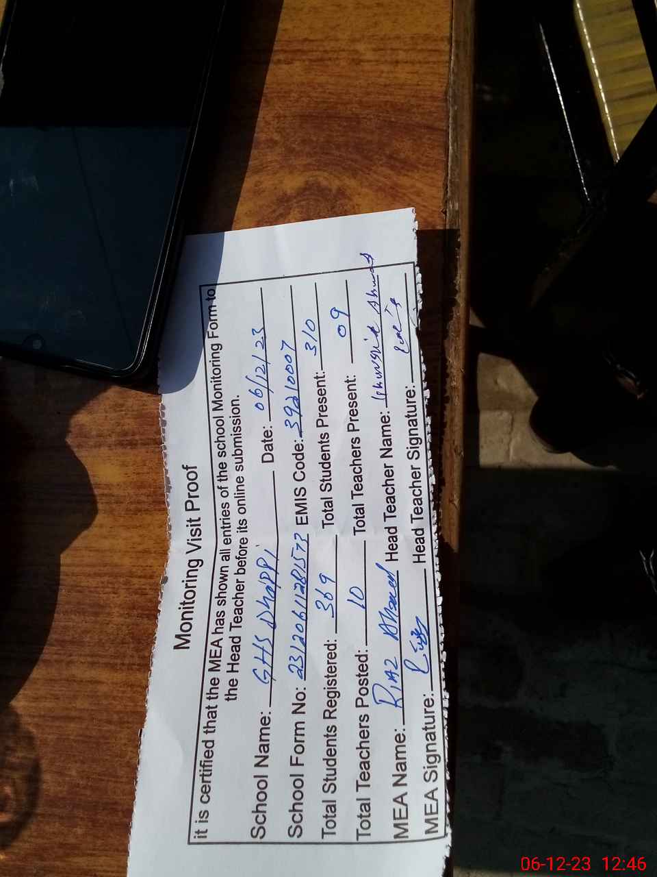 | Attendance Register | Head Teacher | MEA with School | Visit Proof |