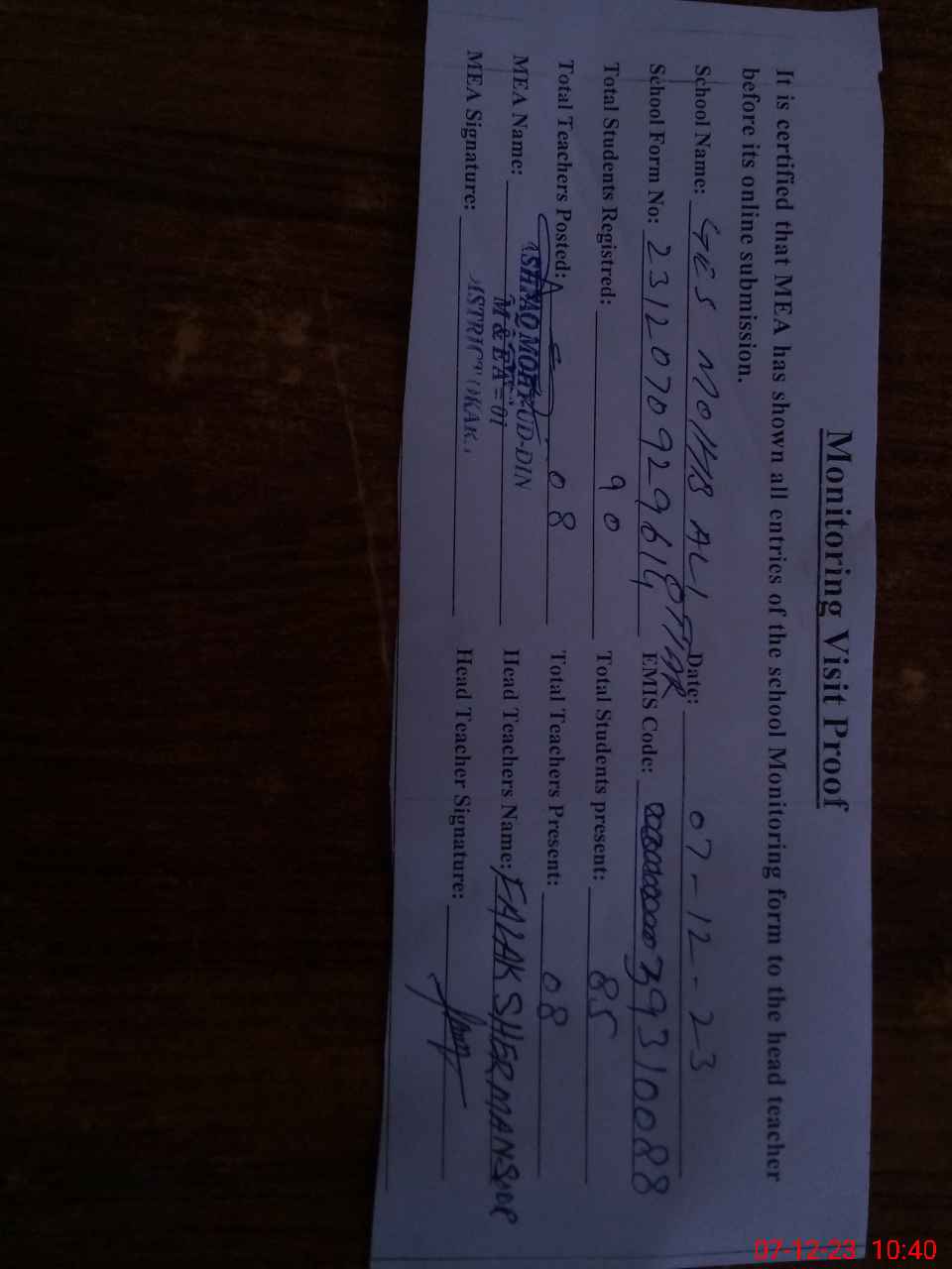 | Attendance Register | Head Teacher | MEA with School | Visit Proof |