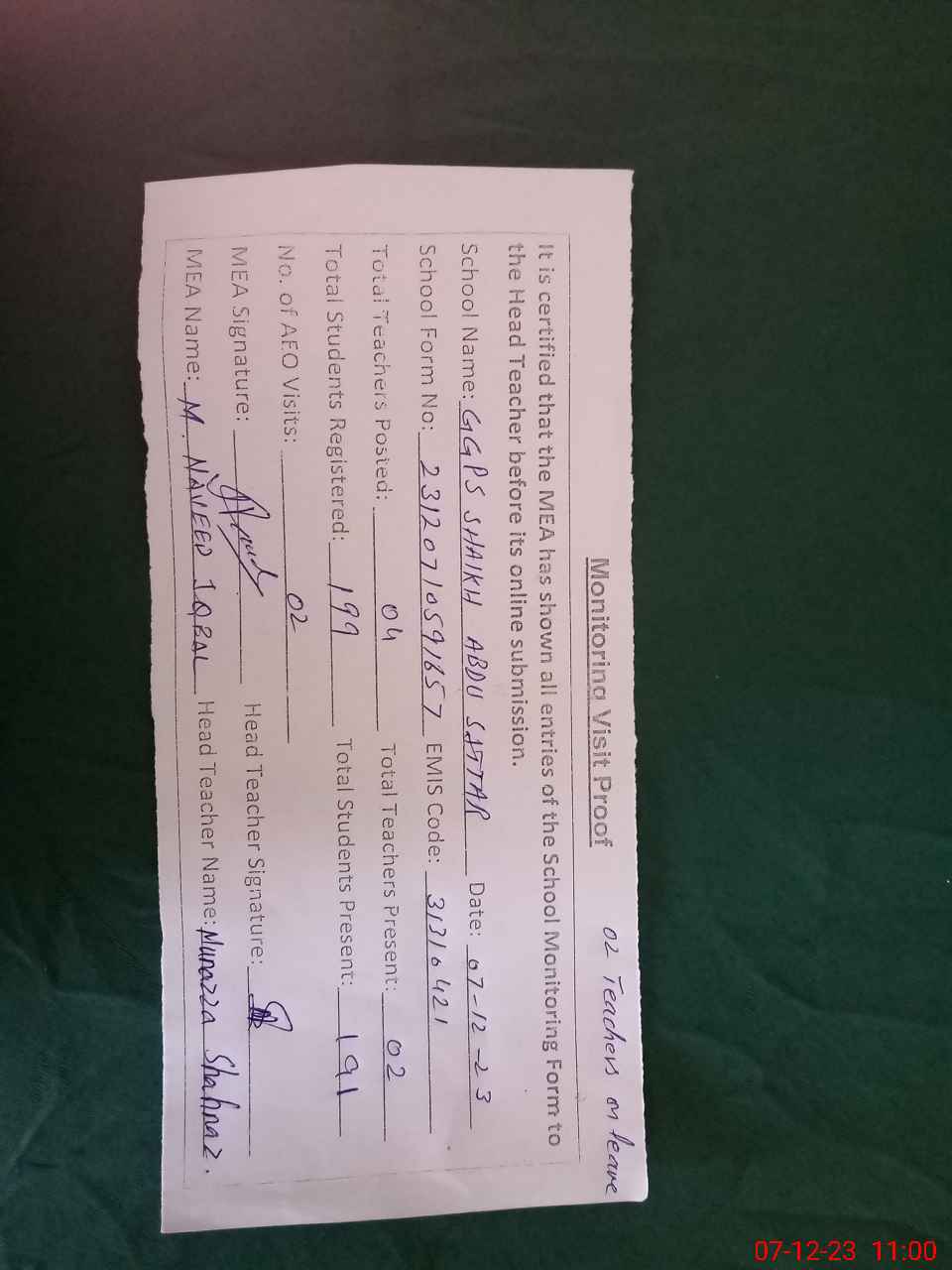 | Attendance Register | Head Teacher | MEA with School | Visit Proof |