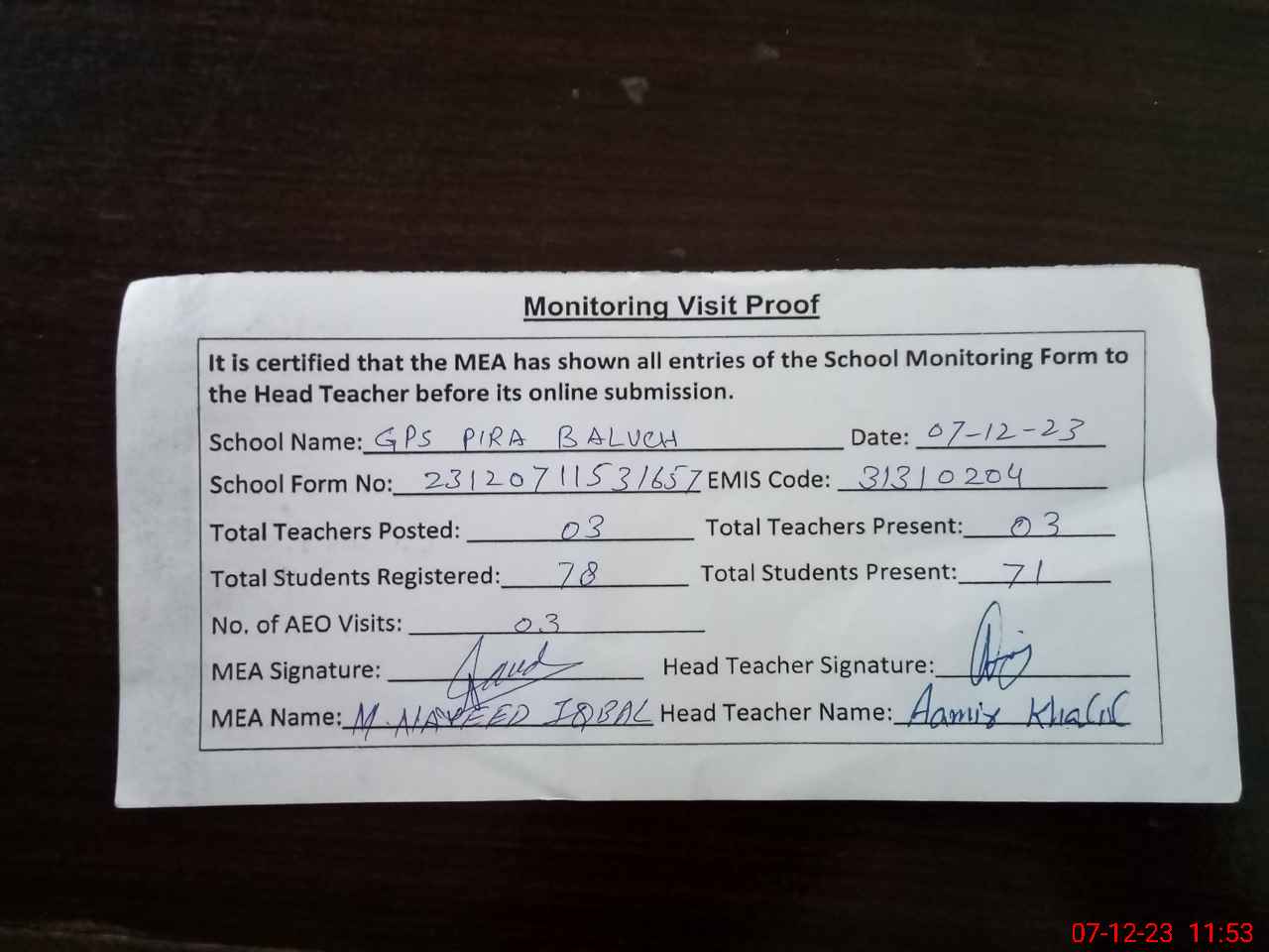 | Attendance Register | Head Teacher | MEA with School | Visit Proof |
