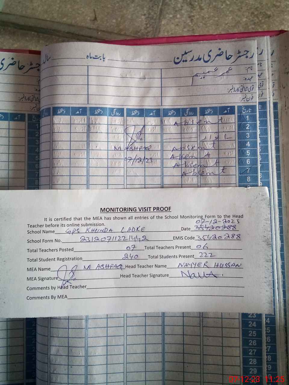 | Attendance Register | Head Teacher | MEA with School | Visit Proof |