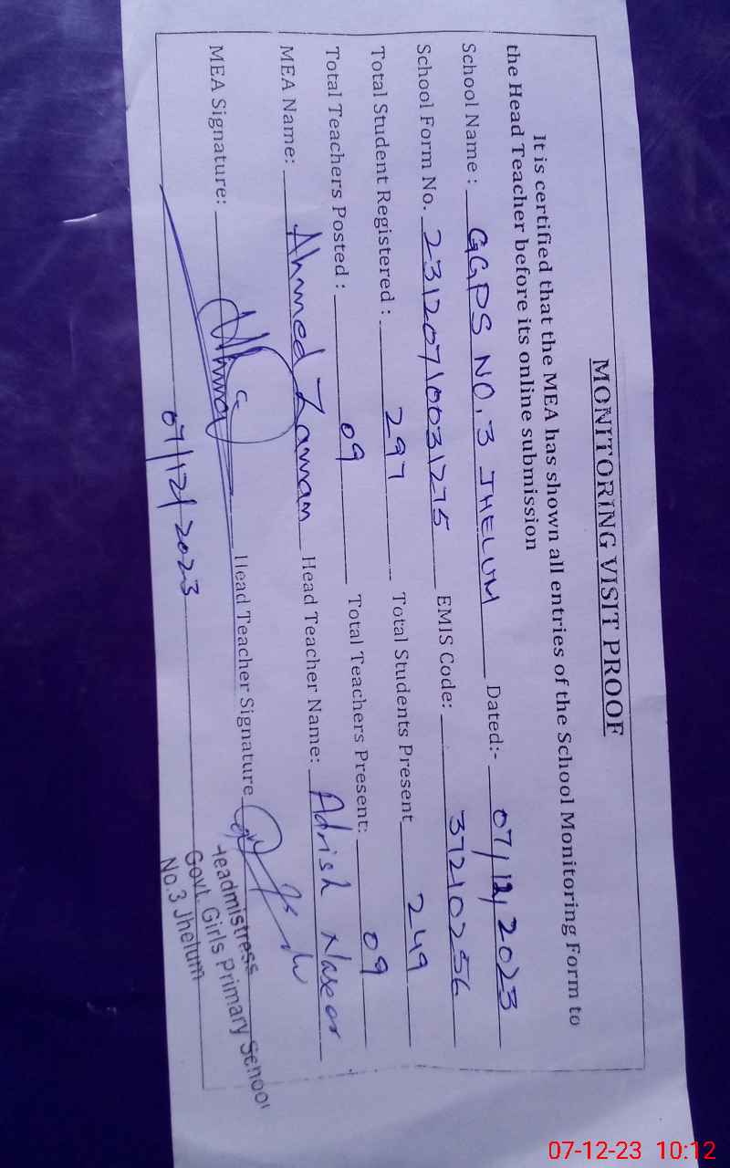 | EMIS Code: 37210256 | Name of School: GGPS NO. 3 JEHLUM | |||