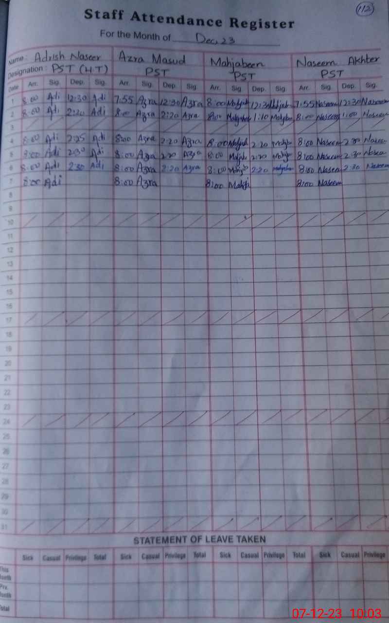 | CNIC | Full Name | Designation | R/C | Absence During Last Calender Month |