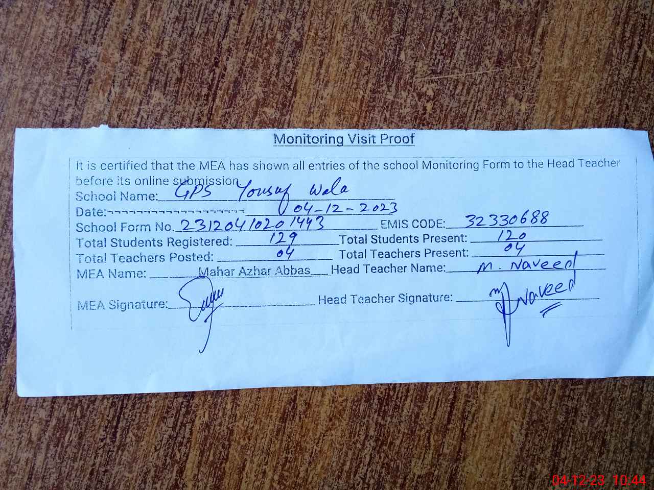 | EMIS Code: 32330688 | Name of School: GPS YOUSAF WALA | |||