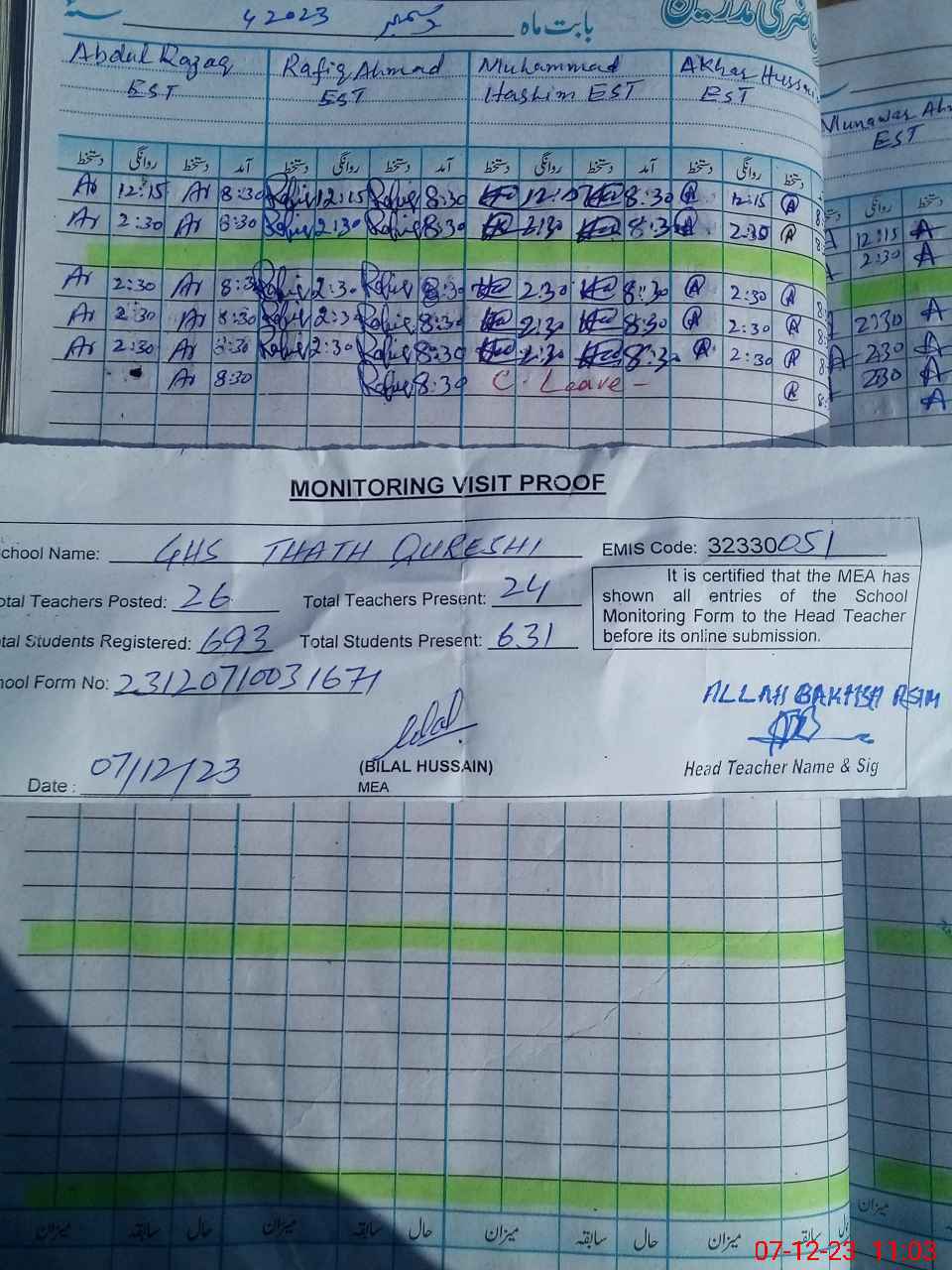 | Attendance Register | Head Teacher | MEA with School | Visit Proof |