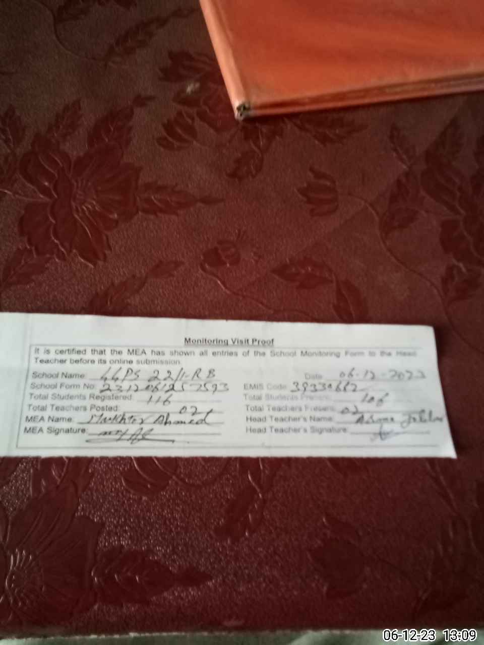 | Attendance Register | Head Teacher | MEA with School | Visit Proof |