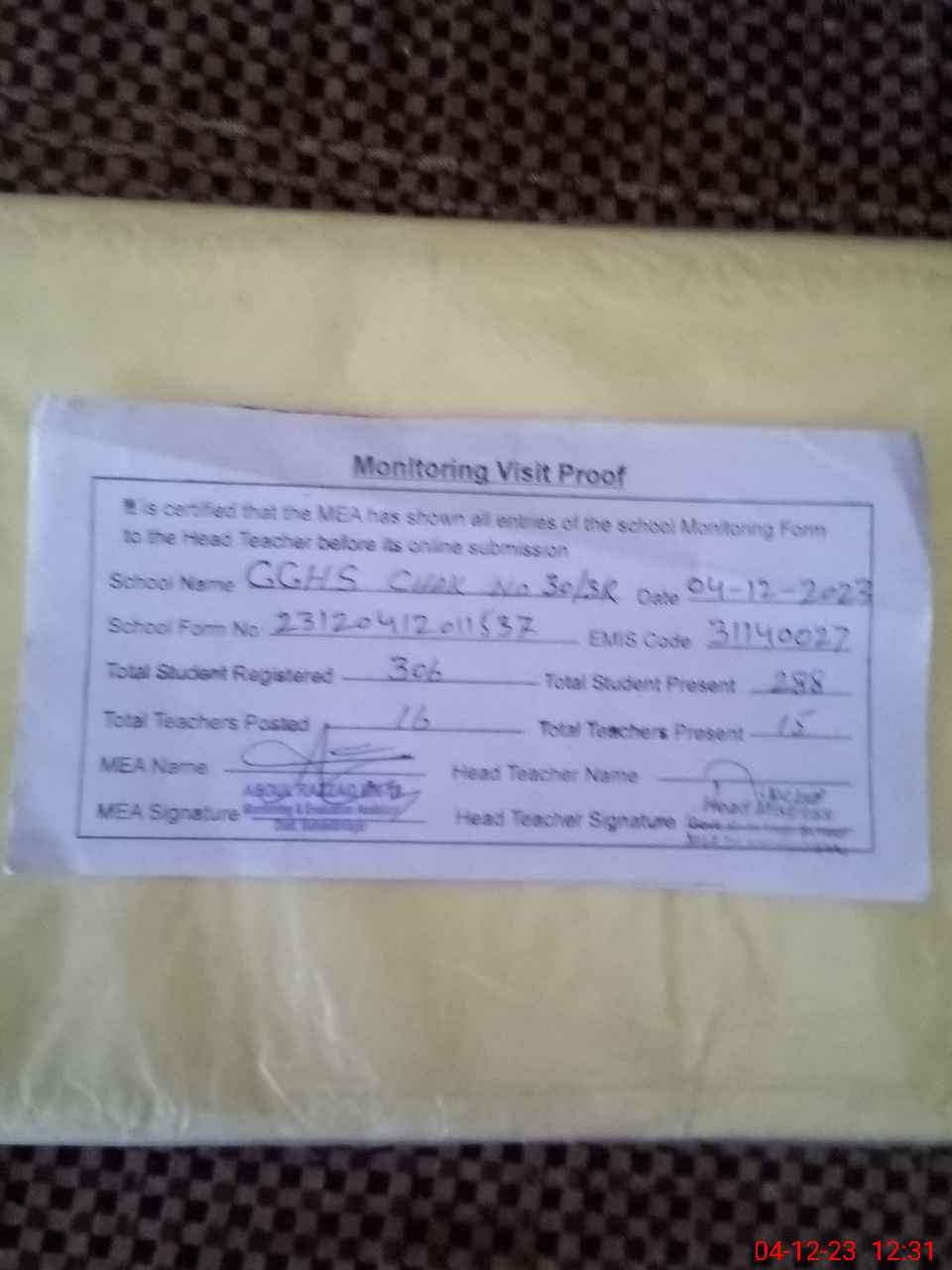 | EMIS Code: 31140027 | Name of School: GGHS CHAK NO.30/3-R | |||