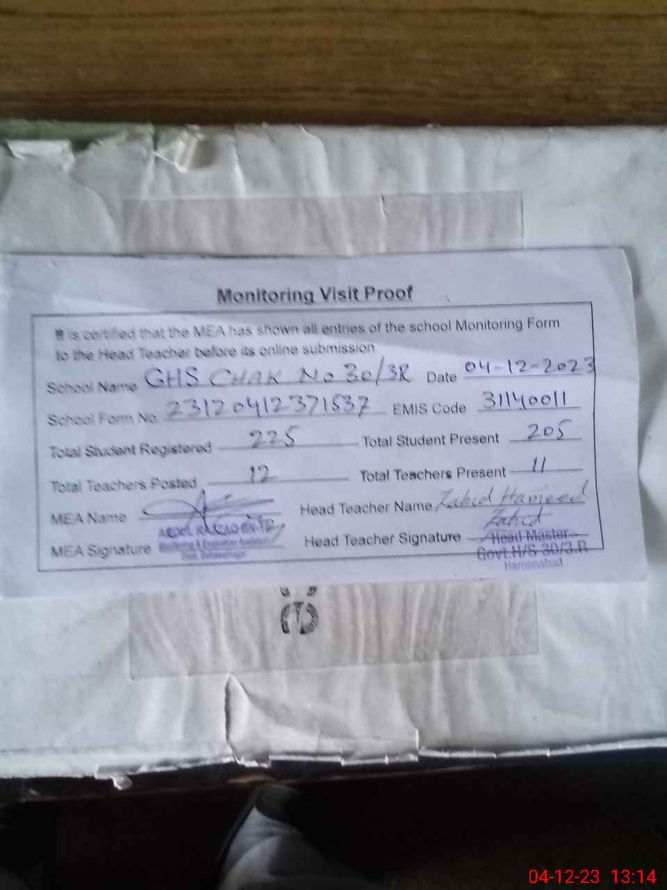 | Attendance Register | Head Teacher | MEA with School | Visit Proof |