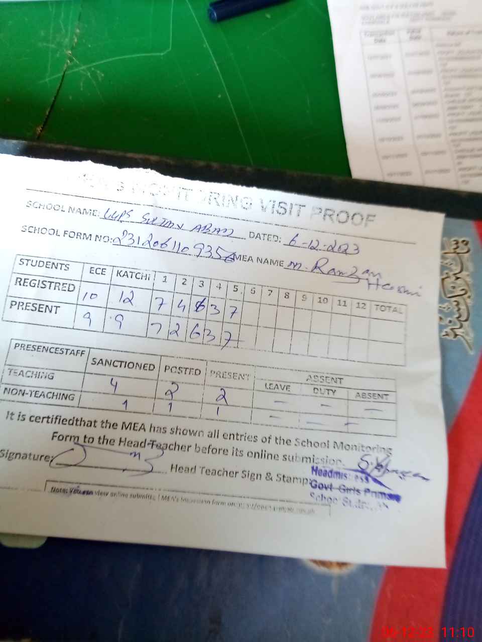 | Attendance Register | Head Teacher | MEA with School | Visit Proof |