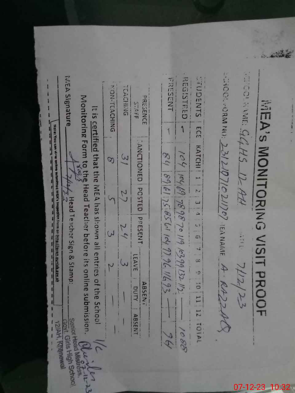 | EMIS Code: 36420046 | Name of School: GGHS 12/AH, KHANEWAL | |||