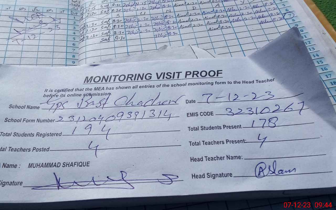 | Attendance Register | Head Teacher | MEA with School | Visit Proof |