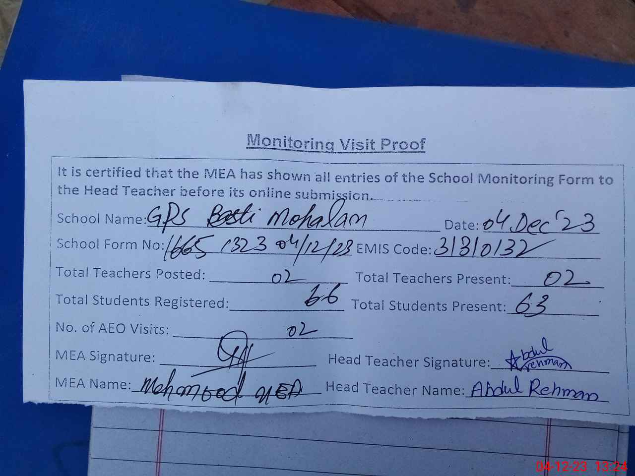 | Attendance Register | Head Teacher | MEA with School | Visit Proof |