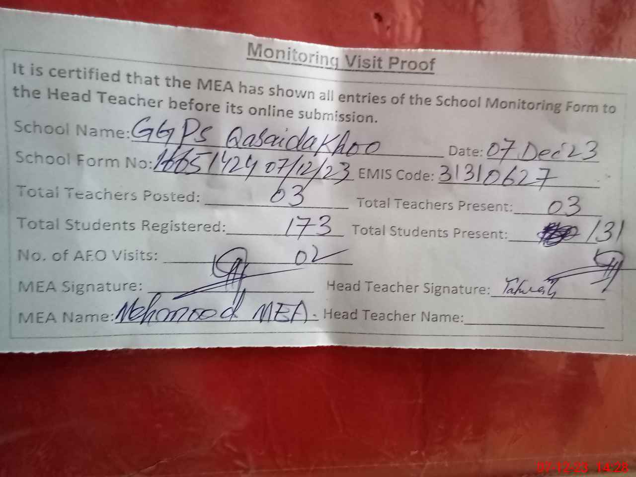 | EMIS Code: 31310627 | Name of School: GGPS QASAIDA KHOO | |||