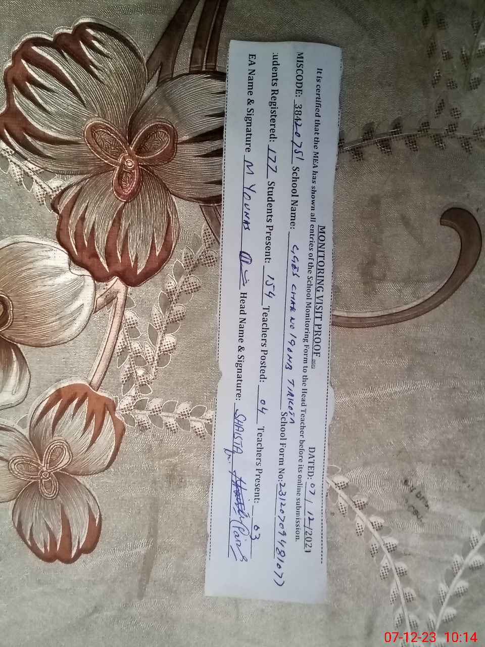 | Name: SH**** RA**** Designation: (School Headmaster's/Headmistress's) SST Phone/Cell Number: 03**** |