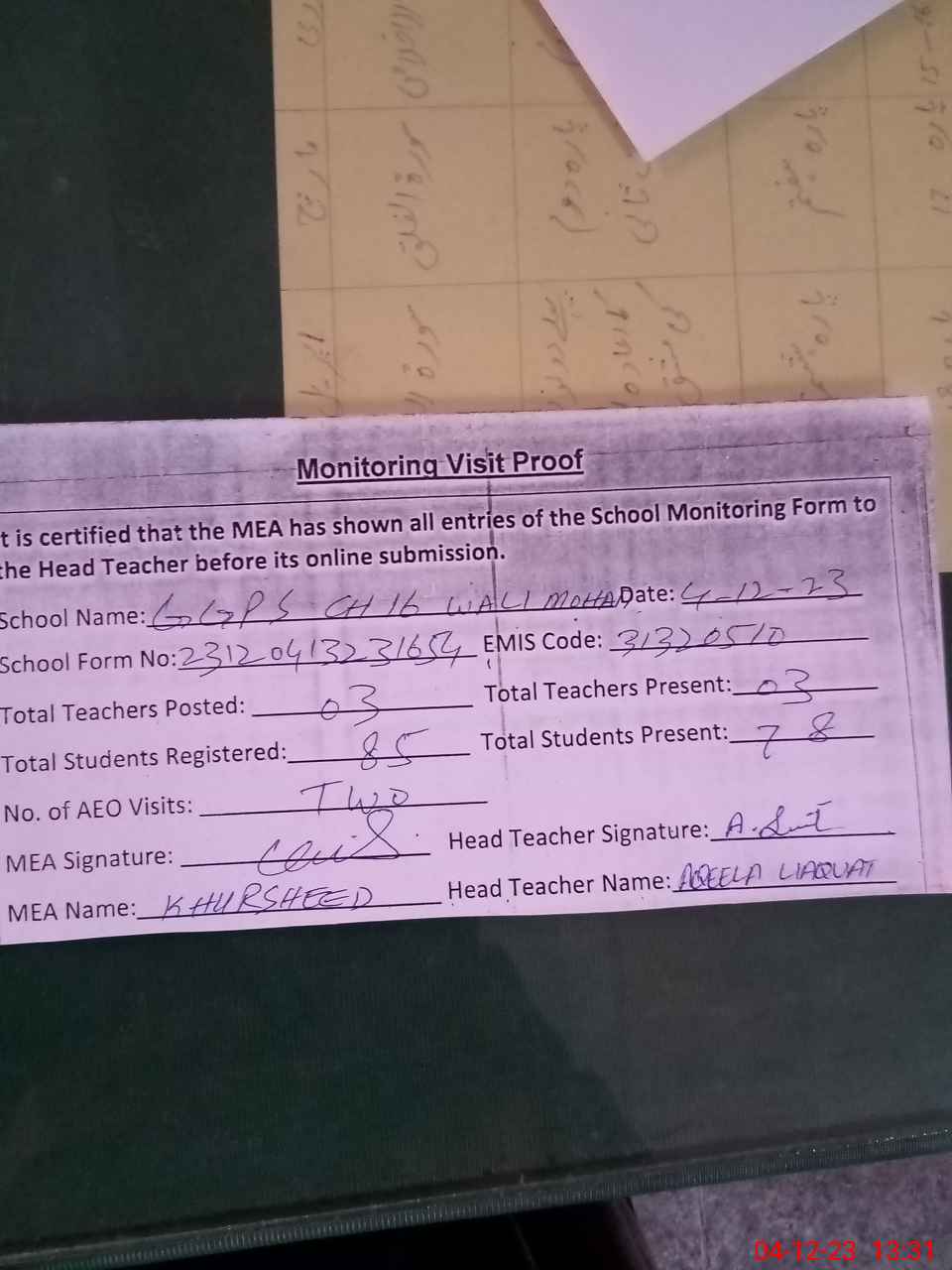 | Attendance Register | Head Teacher | MEA with School | Visit Proof |