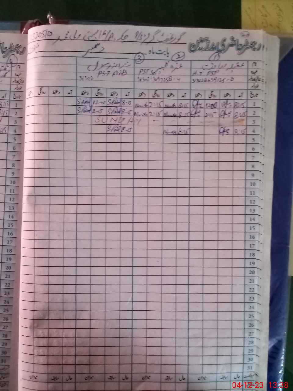 | CNIC | Full Name | Designation | R/C | Absence During Last Calender Month |