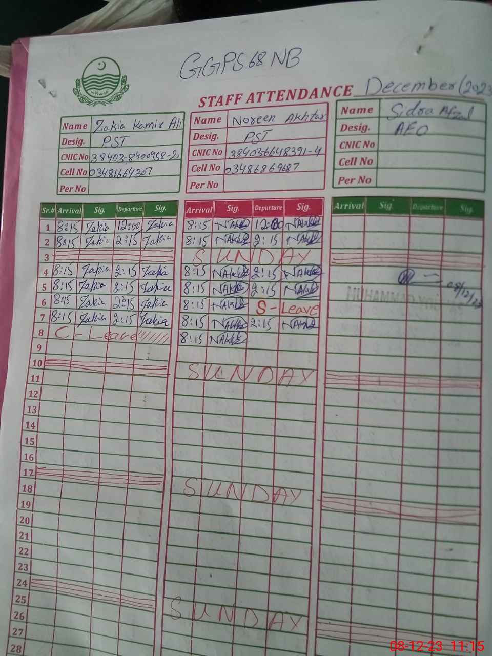 | CNIC | Full Name | Designation | R/C | Absence During Last Calender Month |