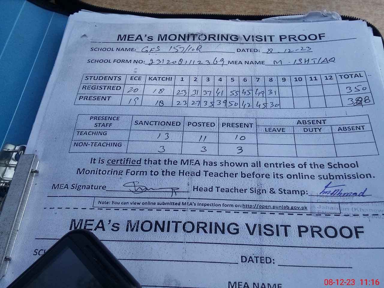 | Attendance Register | Head Teacher | MEA with School | Visit Proof |