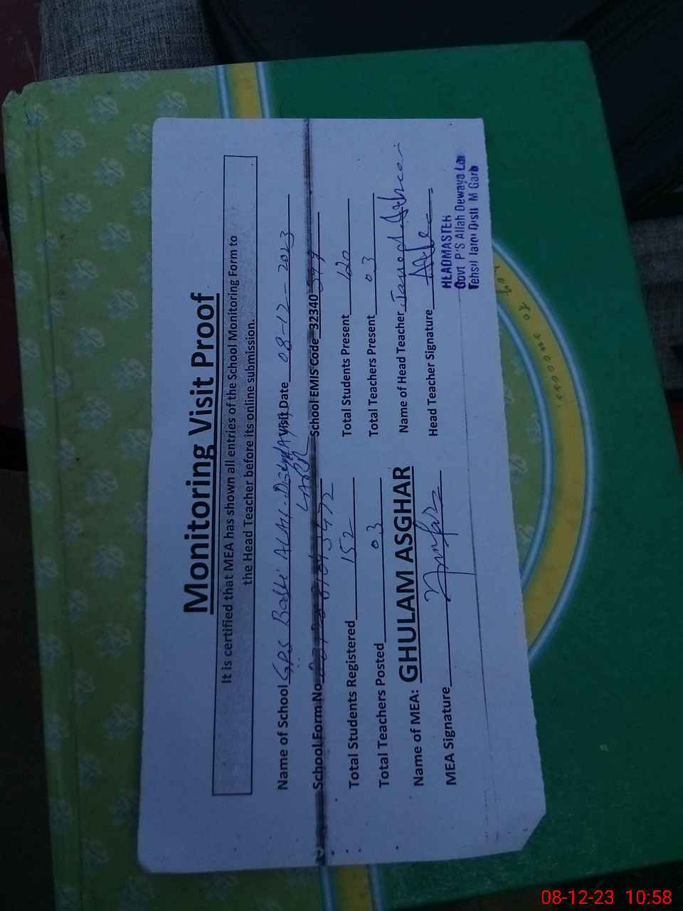| Attendance Register | Head Teacher | MEA with School | Visit Proof |